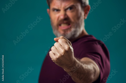A portrait of bearded angry man showing fist at camera. Peopel and emotions concept