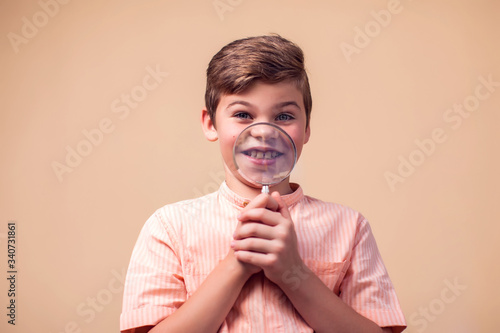 A portrait of kid boy holding magnifier. Children and knowlage concept