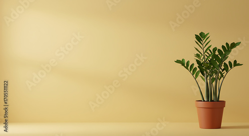 A potted Zamioculcas zamiifolia plant against a pale yellow wall.