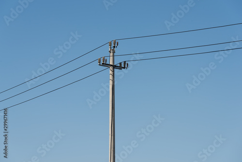 A power pole in a cloudless blue sky closeup