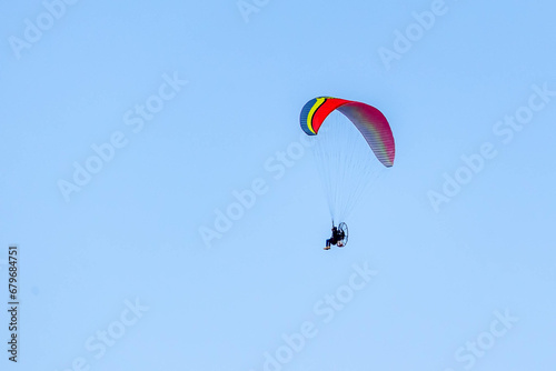 A Powered paragliding also knows as Paramotor flying through the blue sky. Sport. Leisure. Adventure.