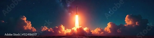 A powerful rocket launches into the night sky, leaving a fiery trail of smoke and light The majestic scene is captured against a backdrop of twinkling stars , beautiful, amazing, cosmos