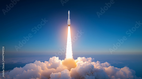A powerful space rocket launching into the blue sky, leaving behind a dramatic trail of flames and smoke, symbolizing exploration, power, and innovation.