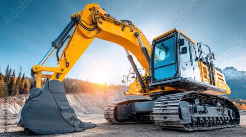 A powerful yellow excavator works on a construction project under a bright, sunny sky.