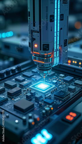 A precision tool working on a microchip, illuminated by blue lights. Ideal for themes in technology, engineering, and electronics, perfect for marketing and educational materials