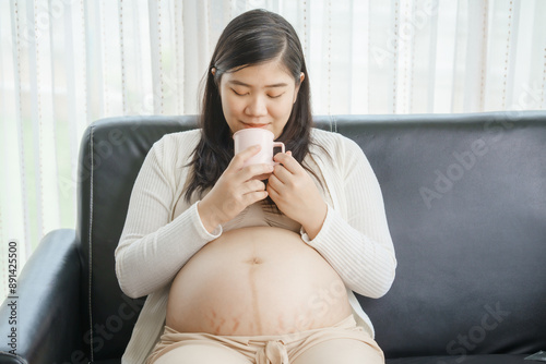 A pregnant mother sits on the sofa, looking at her phone and shopping online. She is preparing to buy items for her unborn child, filled with anticipation and excitement for the arrival.