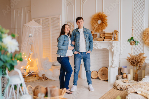 a pregnant woman and a man in denim in the white room. mortgage.