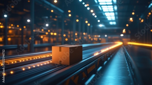 A priority shipping box placed on a conveyor belt under bright warehouse lights