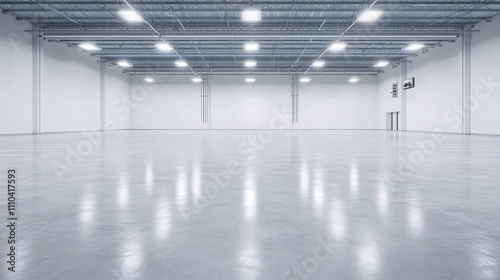 A pristine, empty parking area with bright overhead lights illuminating the rows of neatly marked spaces. The polished concrete floor reflects the lighting softly, while the distant view reveals