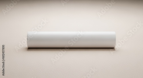 A pristine white cylindrical object rests on a neutral beige , showcasing its smooth texture and simple elegance.