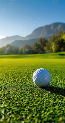 A pristine white golf ball rests on a verdant putting green, with a majestic mountain range softly blurred in the background under a clear blue sky