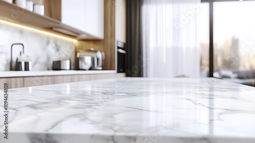 A pristine, white marble kitchen countertop with subtle grey veining, polished to a smooth, reflective finish. The background is softly blurred.