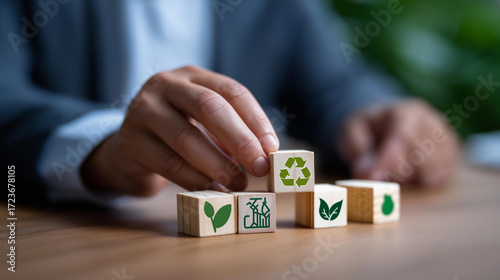 A professional arranges wooden blocks with LCA icons, hyper-realistic visuals of environmental impact with clear textures, moody shadows on a table, bright saturation in eco visual