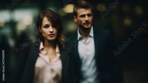 A professional business couple walks together in a blurred urban setting at night exuding confidence