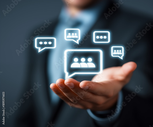 A professional businessman presenting a glowing holographic group chat icon, symbolizing digital communication, teamwork, customer support, and social networking in modern business.