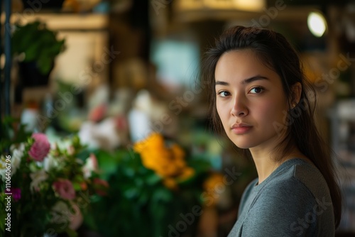 A professional female florist stands in the foreground