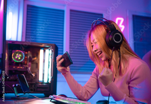 A Professional female pro gamer play online mobile games cyber sport and esport winner emotion. Young woman in tournament match worldwide in room colorful neon lights.