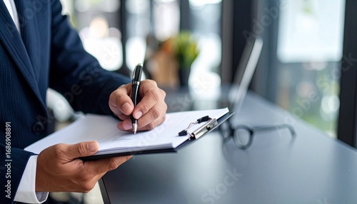 A professional in a suit, reviewing and making notes on a document in a office setting. The scene emphasizes the importance of attention to detail and professionalism in the workplace.