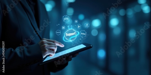 A professional interacting with a digital device, showcasing customer support services with futuristic visual elements.