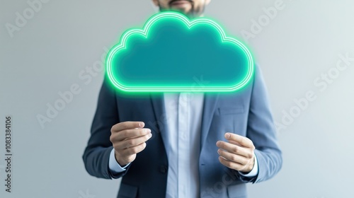 A professional man holding a glowing cloud symbol, representing digital technologies and cloud computing in a modern setting.