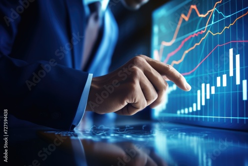 A professional man in a business suit pointing at a computer screen, indicating important information.