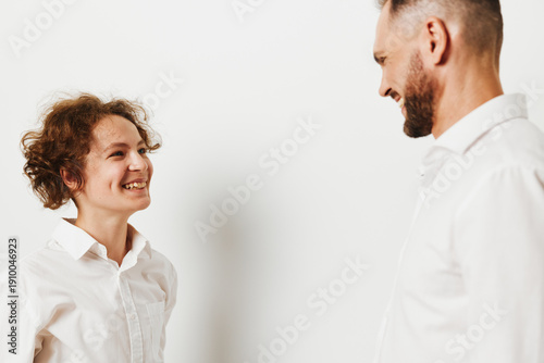 A professional man stands across from a smiling colleague against an isolated colored background, conveying confidence, warmth, and positive emotion in a business scene.