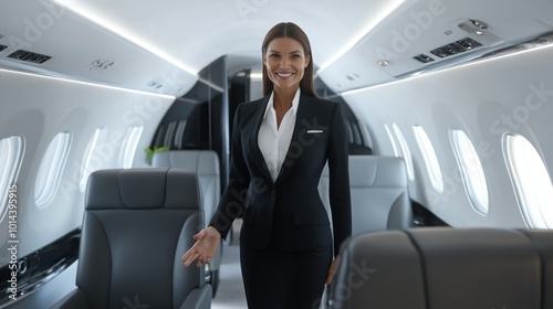 A professional woman stands in a modern private jet interior, showcasing luxury travel.