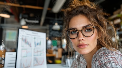 A professional woman with glasses looking confidently at data charts in an office setting, symbolizing business analysis and strategy development.