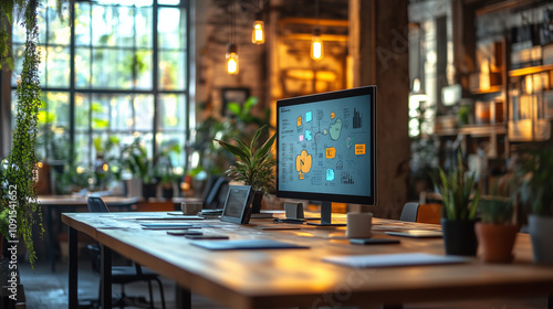 A professional workspace highlighting collaborative tools where employees visualize business models on interactive boards