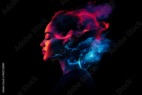 A profile view of an abstract female head with colorful nebulae creates a surreal atmosphere on a dark background.