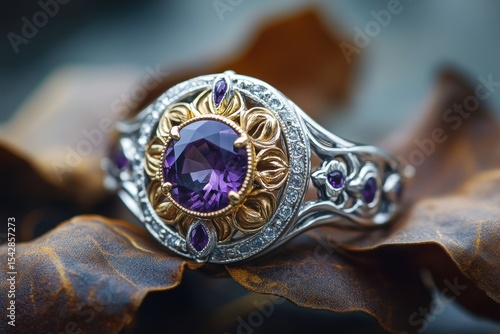 A purple and white ring with a diamond in the center. Elegant jewelry designs featuring stunning gemstones and vintage flair.