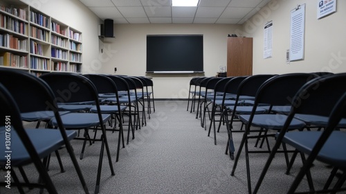 A quiet and professional conference space with built-in shelving, neutral tones, and comfortable seating.