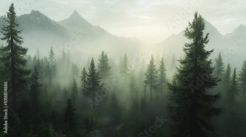 A quiet morning in a dense foggy forest at sunrise nature background