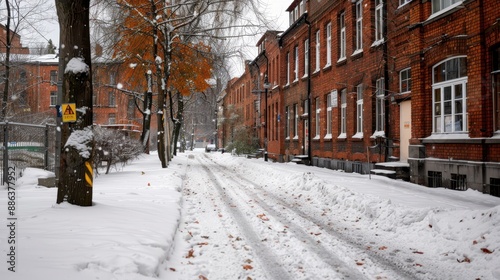 A quiet urban street blanketed in snow, flanked by red brick buildings. The trees add a touch of nature to the serene winter cityscape scene.