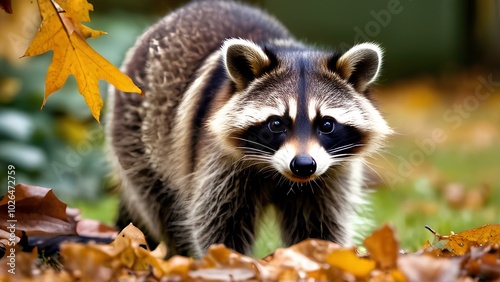 A raccoon investigates an autumn backyard covered with golden leaves. The crisp fall air and vibrant foliage provide a serene backdrop for the animal exploration.
