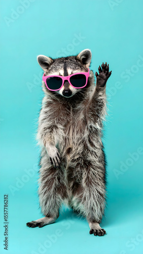 a, raccoon, standing, with, sunglasses, on, solid, at, turquoise, background, animal, mammal, ferret, wildlife, wild, nature, white background, isolated, polecat, animals, waving, hands, nod, hint