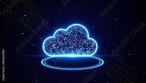 A radiant holographic cloud icon with glowing energy s projects a futuristic 3D image, symbolizing advanced technology and seamless connectivity for the viewer.