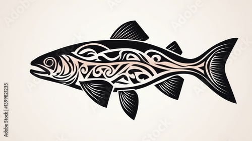 a rainbow trout tribal tattoo design, decorative line art, monochrome ink, isolated on white background