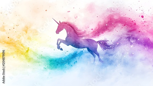 A Rainbow Watercolor Unicorn Leaps Through Colorful Clouds