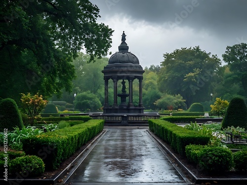 A Rainy Day in the Park: Gazebo, Greenery, and Path
