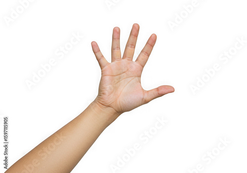 A raised human arm and hand with fingers spread on dark space on transparent background