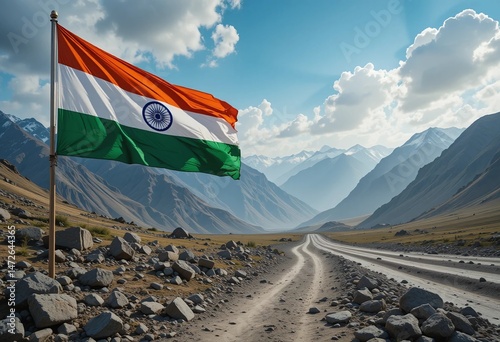 A real Indian tricolor soaring high in the wind at the Kashmir border with scenic sky backdrop—symbolizing strength and sovereignty in vivid stock photography.