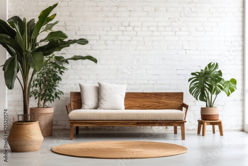 A real photograph shows a wooden sofa placed next to a bench, with plants, in a white loft interior. An armchair is also seen resting on a rug in the same space.