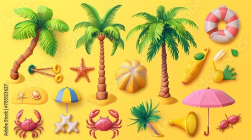 A realistic beach backdrop with palm trees, crabs, parasols, etc.