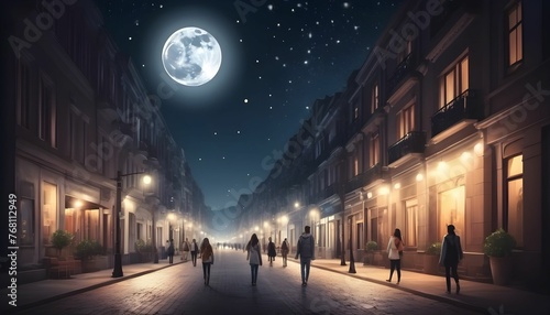 A realistic beautiful street in a city with attractive street lights along people are walking behind it a night view with moon and shinning stars