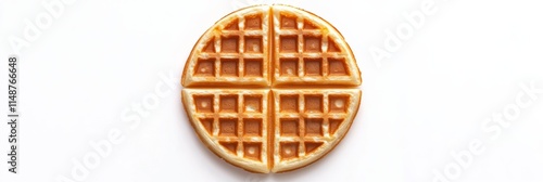 A realistic rendering of a large circular waffle divided into quarters, displayed on white