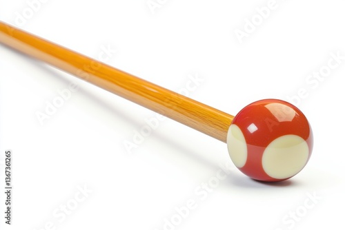 A red and white billiard cue ball sits on a polished surface in a cozy room isolated on transparent background