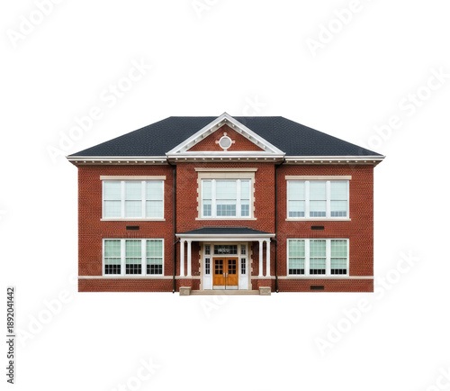 A red brick building with a black roof and white trim, featuring a large window and a door, set png transparent