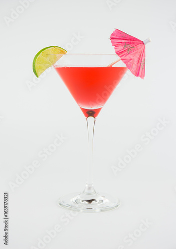 A red cocktail in a classic martini glass with a wedge of lime and an umbrella set against a white background.