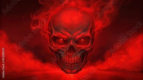 A Red Skull with Glowing Eyes Amidst Smoke